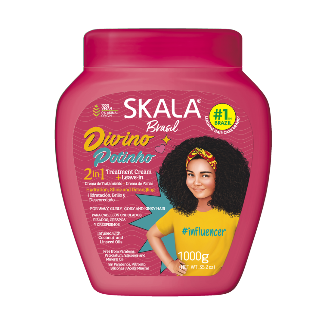 Skala Brasil Divino Potinho was created to make wash day easier and more joyful for kids with curly and coily hair. Its gentle, child-friendly formula combines active ingredients that hydrate, add shine, and control frizz—leaving curls smooth, defined, and nourished. Designed especially for detangling, it turns hair care into a fun and stress-free routine.
